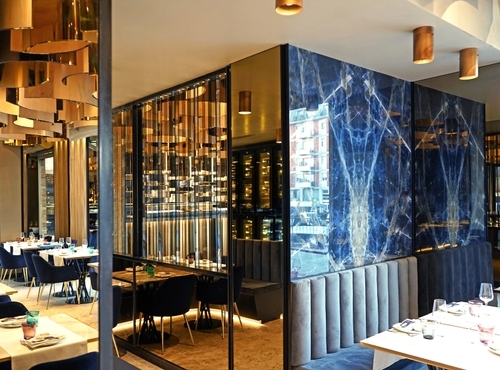 In ogni sala, poi, trova spazio a parete un ‘evento’ dato da pannelli decorativi che richiamano l’effetto della pietra blu sodalite e che risaltano come quadri in una galleria d’arte.