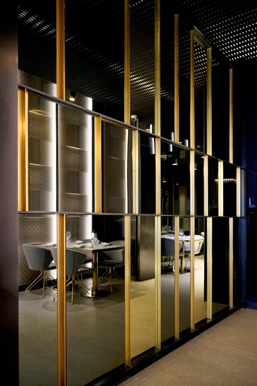 Ogni ambiente è caratterizzato da una differente ricercatezza nei materiali e nell’illuminazione, a creare atmosfera e comfort allo stesso tempo: volumi di legno con velature luminose, superfici specchianti alternate a boiserie di reti metalliche retro-illuminate, soffitti traforati e riflettenti, si avvicendano negli ambienti. La sala posteriore ospita una ‘pergola luminosa’, in memoria della veranda che caratterizzava la sala quand’era ancora un giardino.