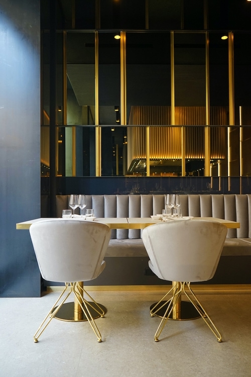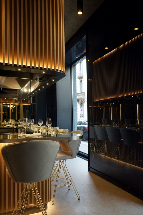 Le sale opposte all’ingresso, più intime, accolgono due postazioni di piastra Teppanyaki, nelle quali è possibile sedere di fronte allo chef per una vera e propria esperienza di degustazione e showcooking sulla elegante vetrina di via Felice Casati.